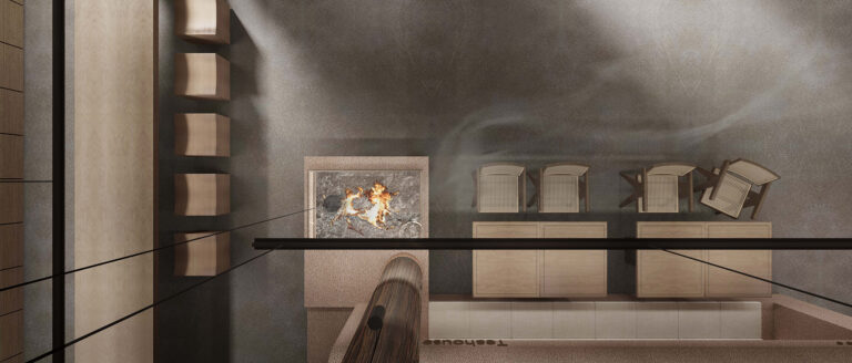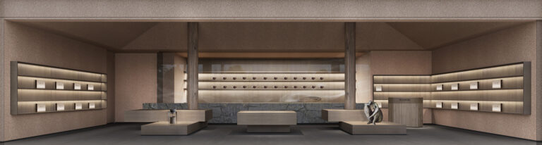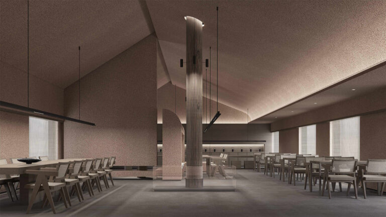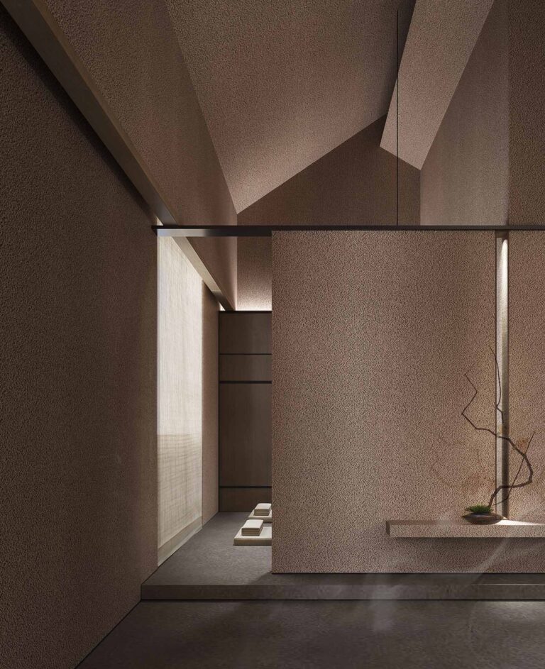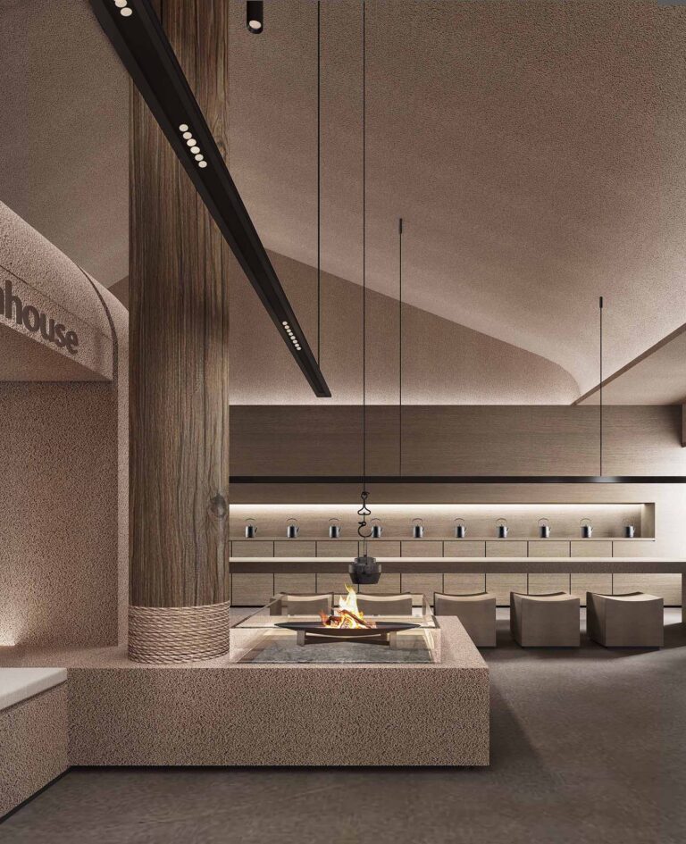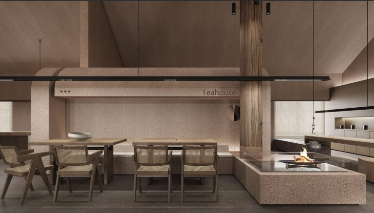 The teahouse features rustic rammed – earth – textured walls and wooden tables and chairs. Open – plan layout and curved structures define spaces. Soft lighting with low – saturation tones, a firepit for warmth, and weaving for charm. Enjoy a relaxing tea experience in natural Zen.